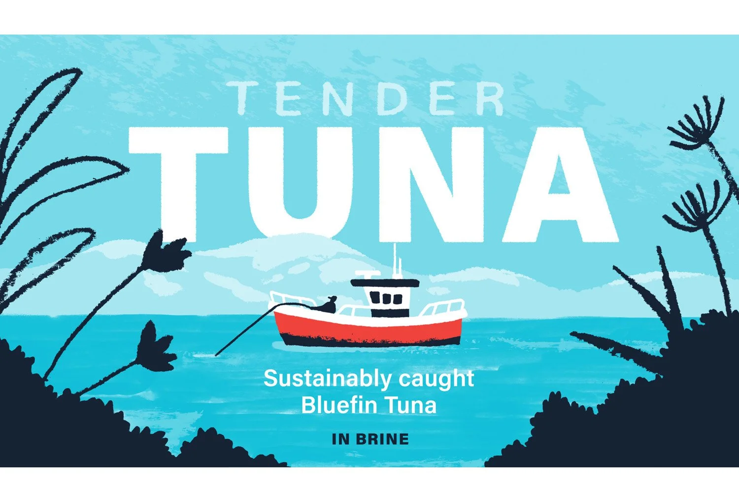 Branding and design for a sustainable Tuna company, all drawn using natural materials and handmade textures.